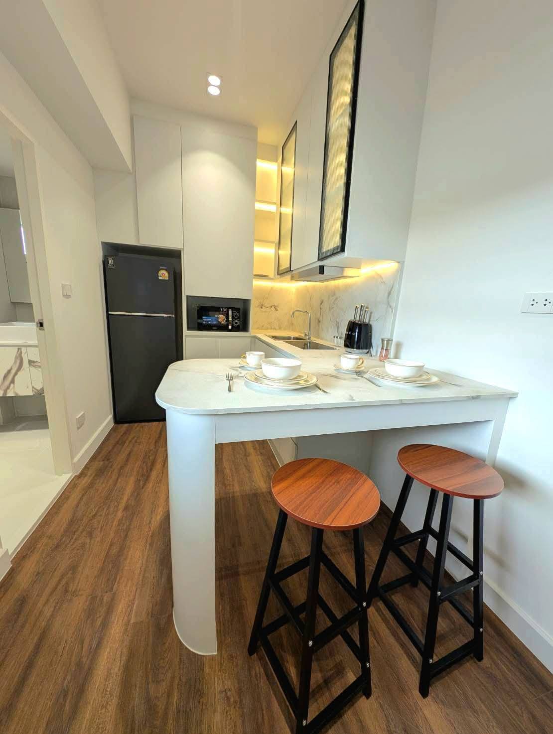 ✔️ ครัว Built-in (เตาไฟฟ้า, เครื่องดูดควัน, ไมโครเวฟ, ตู้เย็น)
